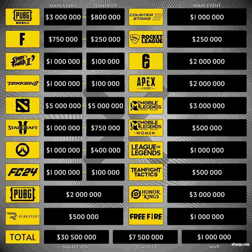 2024年沙特电竞世界杯将于7月3日至8月25日在沙特首都利雅得举行,期间进行包括英雄联盟、王者荣耀、CS2、DOTA2等19个项目的比赛,本次赛事总奖金池超过6000万美元(约合人民币4亿3500万元),其中包括2000万美元的俱乐部奖金(约合人民币1亿4500万元)。