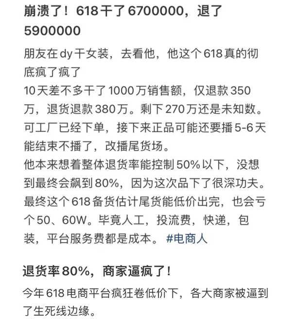不久前有人在小红书上发帖说,朋友在抖音做女装,618期间670万的销售额,因为“仅退款”的政策,退了590万,退款率高达80%,已经把商家逼疯了。